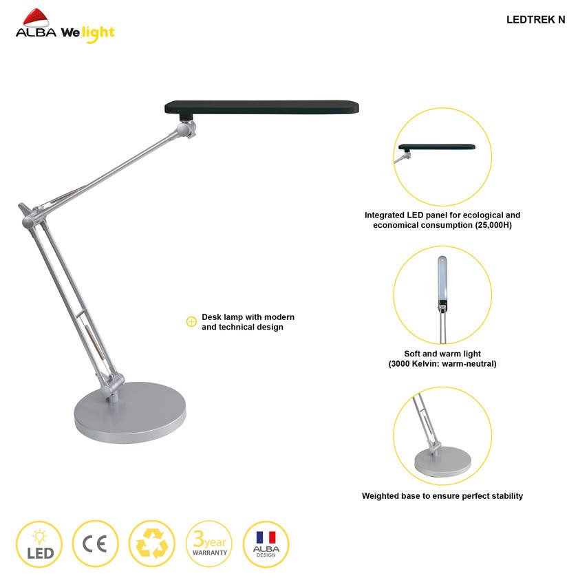 Skrivbordslampa LED Trek, Alba. Skrivbordslampa med modern design. Dubbelledad arm + Justerbart LED-huvud för att justera vinkel och direkt ljus. Fot med vikt för perfekt stabilitet. Strömbrytare på foten. Integrerad LED-panel för miljövänlig och ekonomisk konsumtion (25 000 timmar).