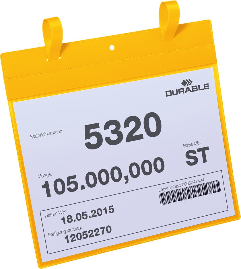 Plastfickorna av slitstark polypropylene går att läsa med skanner. Ett lock gör att inlagan skyddas mot smuts och fukt även utomhus. Fästs med två pilformade band som träs igenom hålen i fickans överkant och sitter sedan ordentligt fast på gallret. Gratis mall för etiketten finns på www.duraprint.se.