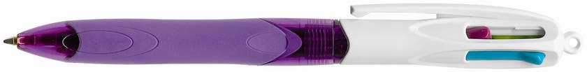 Kulspetspennan som skriver med fyra färger (lila, rosa, lime och turkos). Bic Grip Pro och Bic Fashon har gummerat grepp. Enkelt byter du färg efter dina skrivbehov och uppgifter.