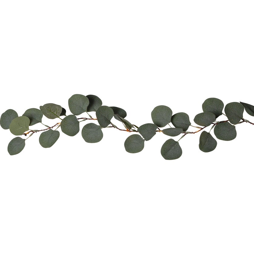 Girland LED Eucalyptus. Vacker dekorationsgirland med eukalyptusblad, 180 cm lång med 20 varmvita ljuspunkter. Med batteridosa och timerfunktion. Batterier ingår ej.