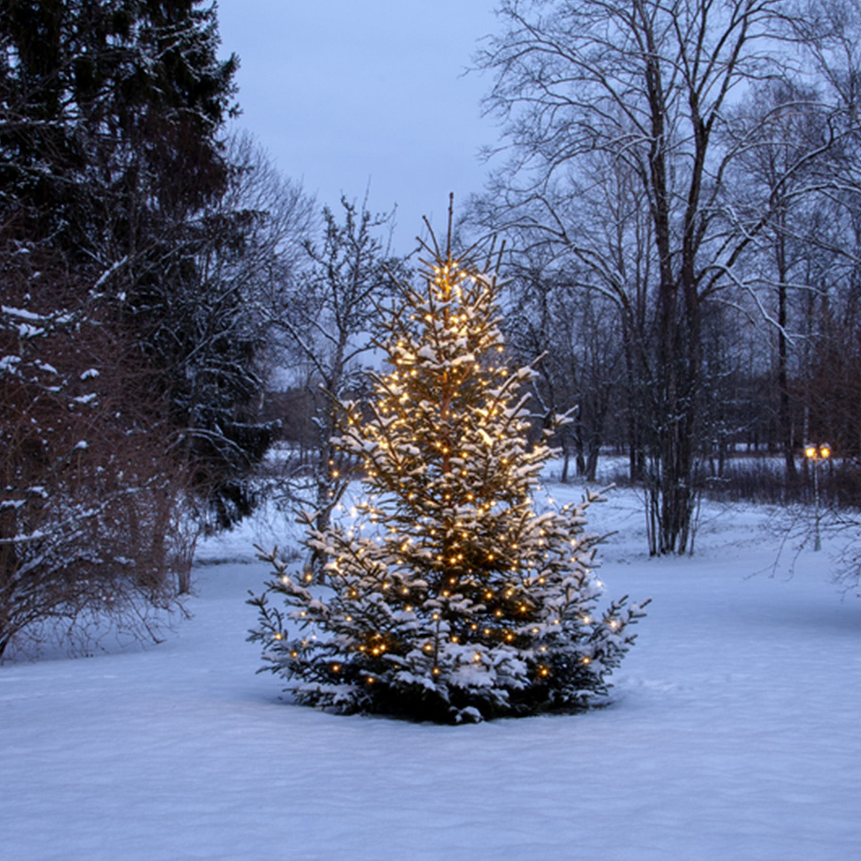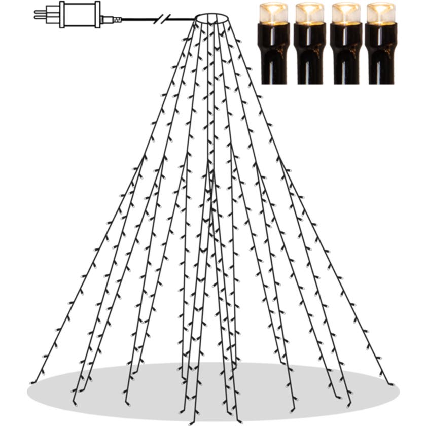 Julgransslinga Shiny med 360 LED-lampor uppdelade på 8 strängar vardera ca 2 meter höga. Slingan lyser med ett vackert varmvitt ljus som fungerar bra på julgranar utomhus och inomhus.