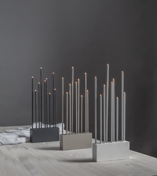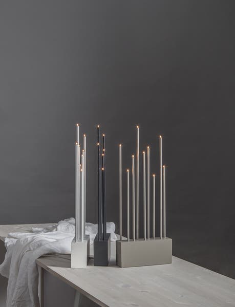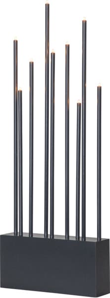 Ljusstake Buzz från Star Trading. Stilren ljusstake med kraftig träbas, ljuspipor av tunna metallrör. 9 st ljuskällor, E5 lampor. Hela ljusstaken i grafit. Textilkabel i vitt/grå. Ger ett härligt stämmnigsfullt ljus hela året runt.