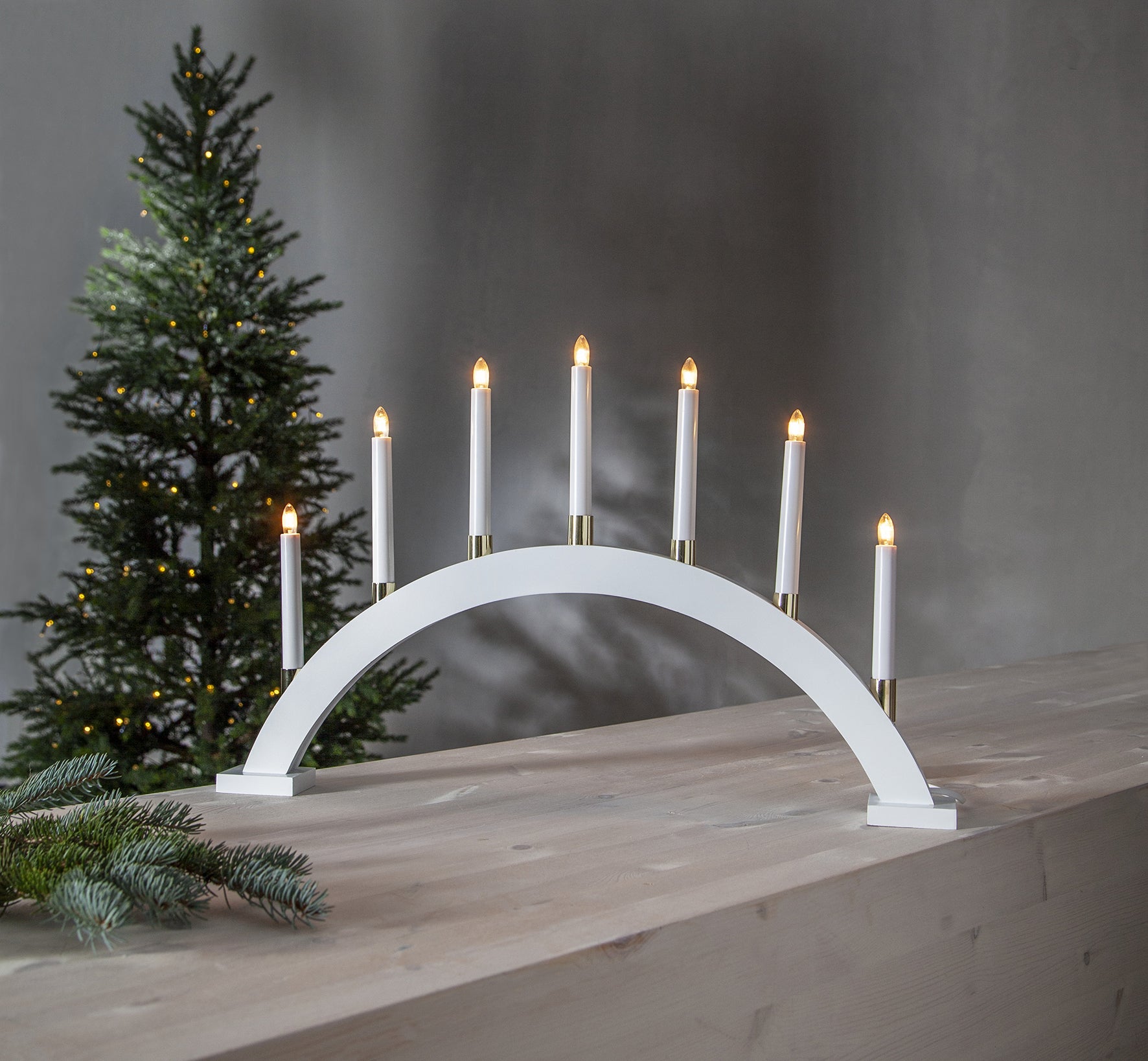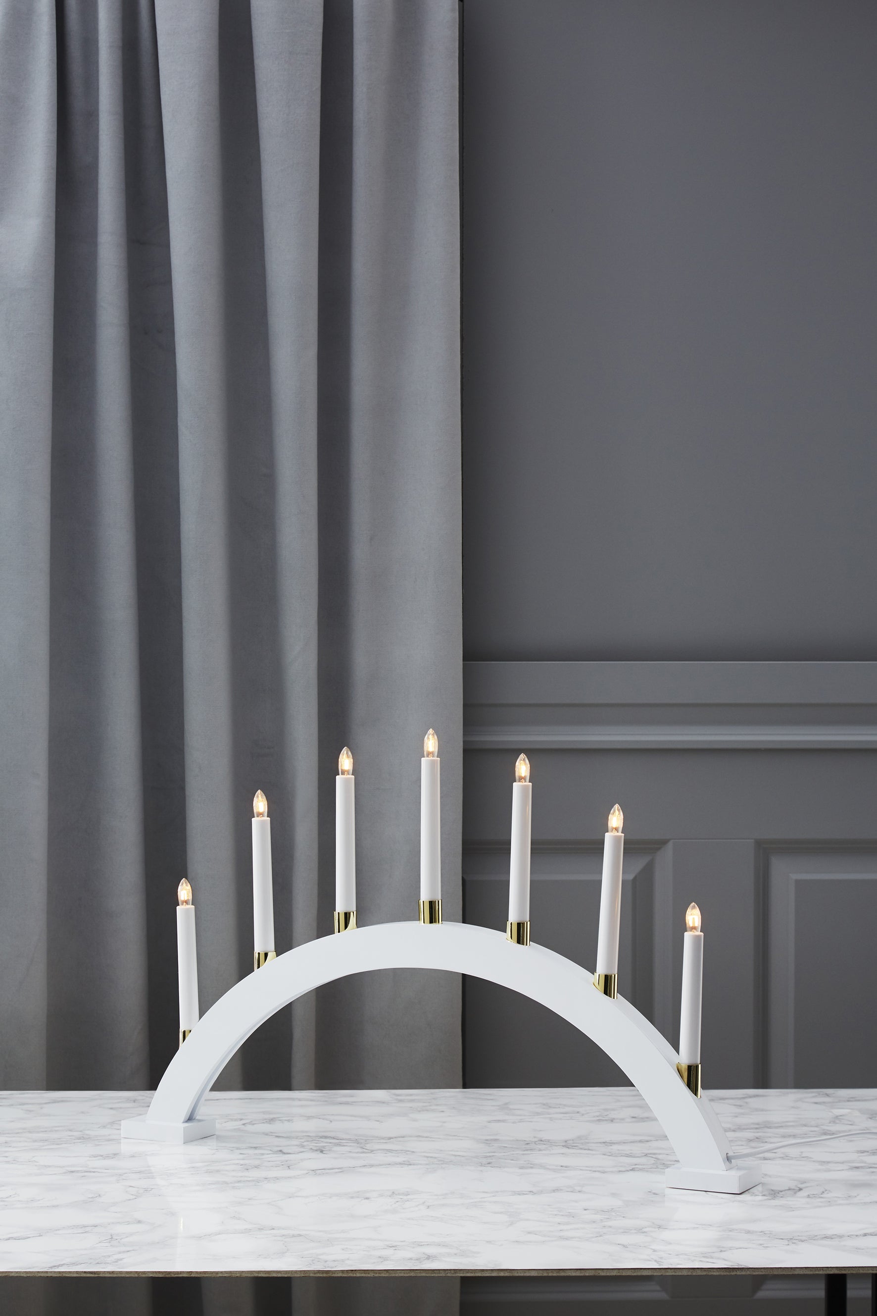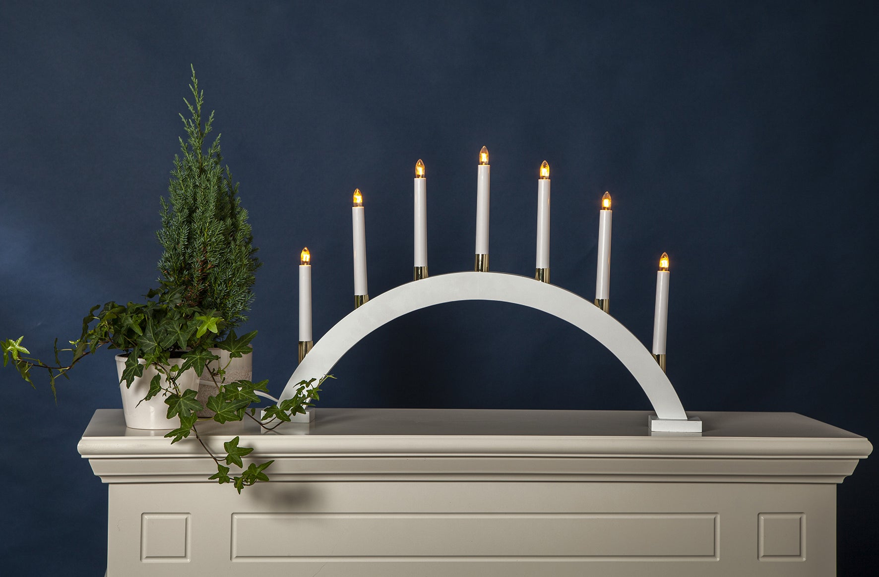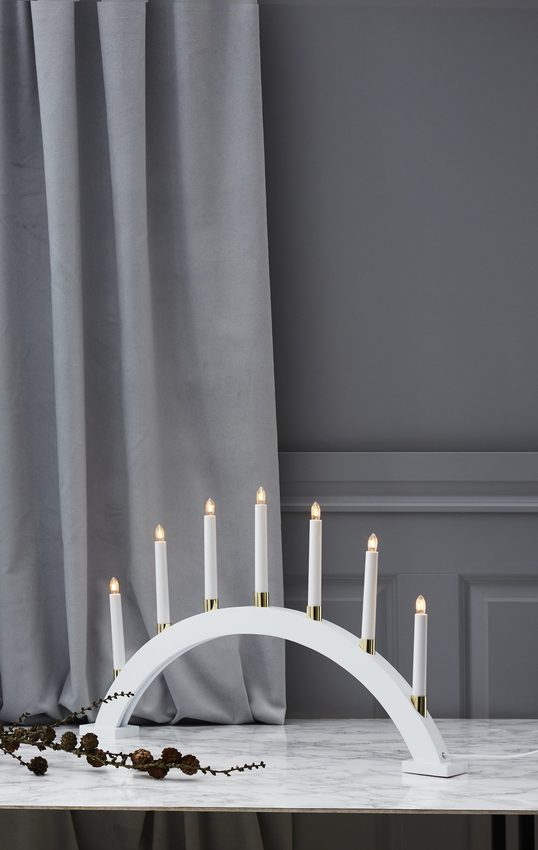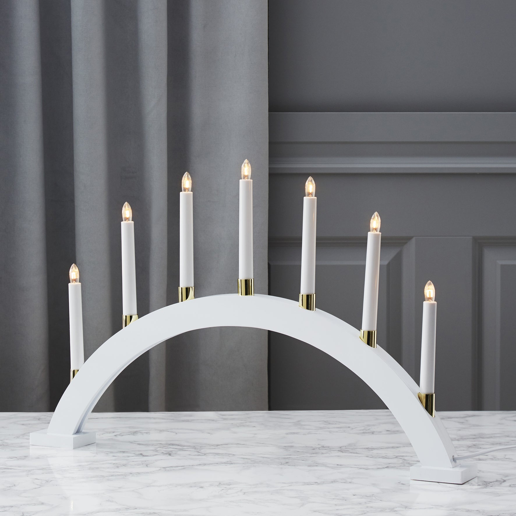 Ljusstake Gillian vit bågformad träljusstake med mässingbelagda ljushållare. Fin adventsljusstake att dekorera med till jul. Ljusstaken har 7 ljuskällor.
