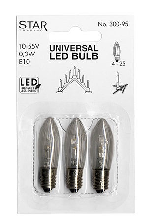 Reservlampa LED 3-pack Sparebulb Universal. Universal LED Bulb reservlampa i 3-pack med E10 sockel, 10-55V. Denna produkt passar till ljusstakar med 4-25 lampor och stickkontakt. Klara lampor.