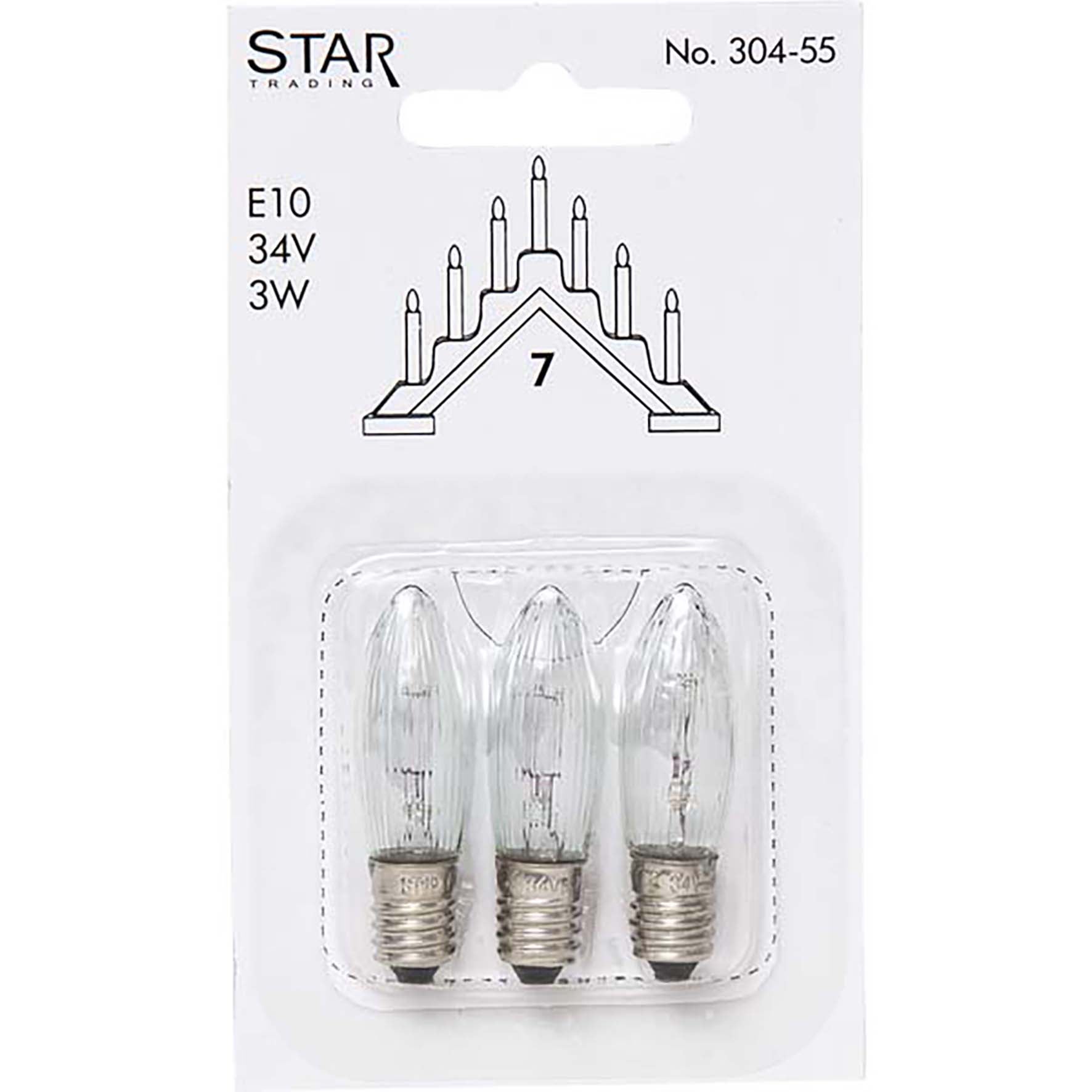 Reservlampa för elljustake. 3-pack sparebulb topplampor med E10 sockel och klart glas. Denna produkt passar till 7-armade ljusstakar med stickkontakt. Användningsområdet är inomhus.