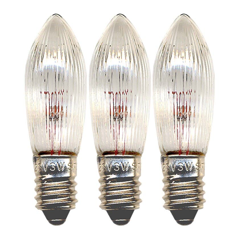 Reservlampa E10 3-pack sparebulb. 3-pack topplampor med E10 sockel och klart glas. Denna produkt passar till de 5-armade ljusstakar med stickkontakt. Användningsområdet är inomhus.