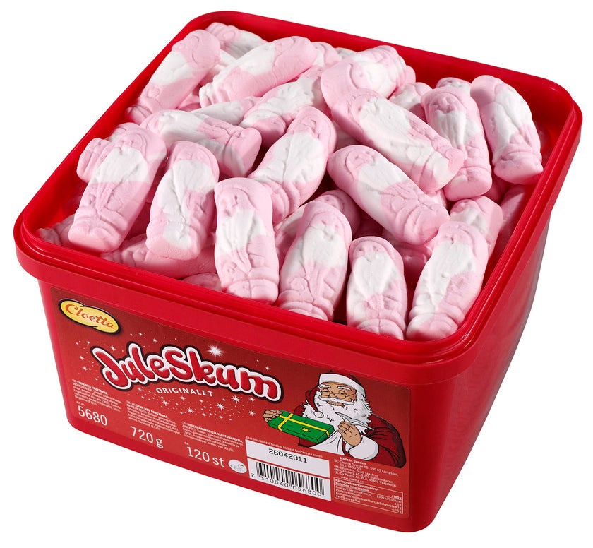 Det älskade originalet Juleskum. En hel låda med rosa fluffiga tomtar med vitt skägg – oemotståndligt goda. Det är inte konstigt att Juleskum är en av svenska folkets favoriter när det gäller julgodis. Ingen jul utan Juleskum!