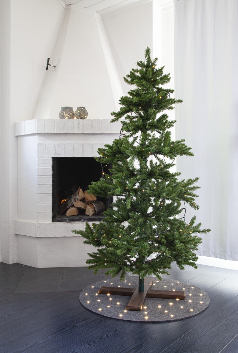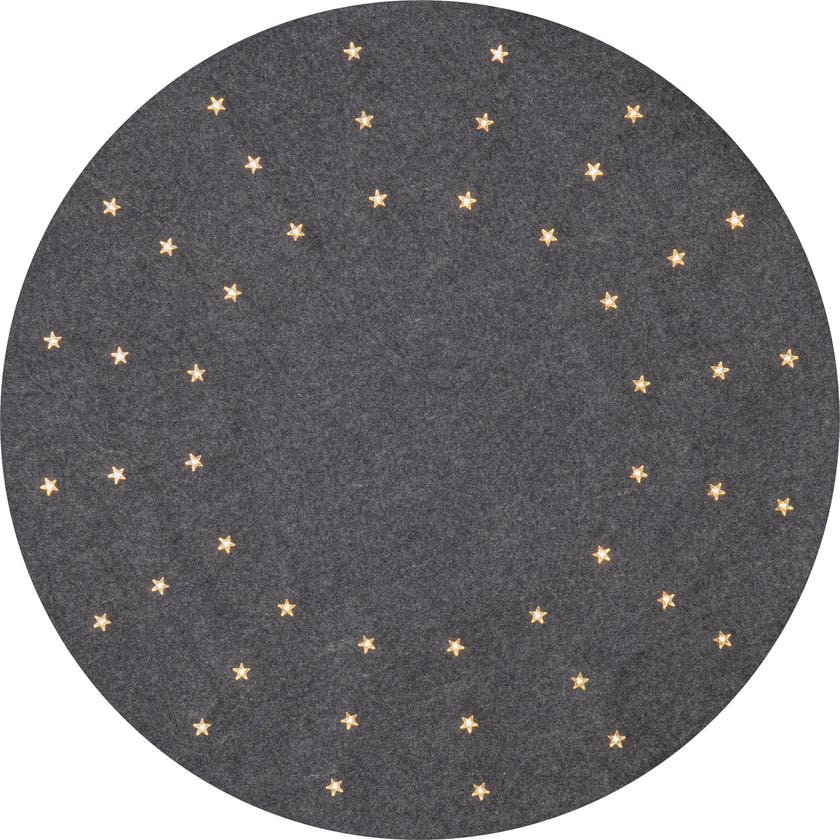 Julgransmatta LED Granne. Grå granmatta med diameter 800 mm. 48 varmvita LED lyser igenom de genomskinliga stjärnorna som sitter i mattan. En vacker dekoration att ha under granen.