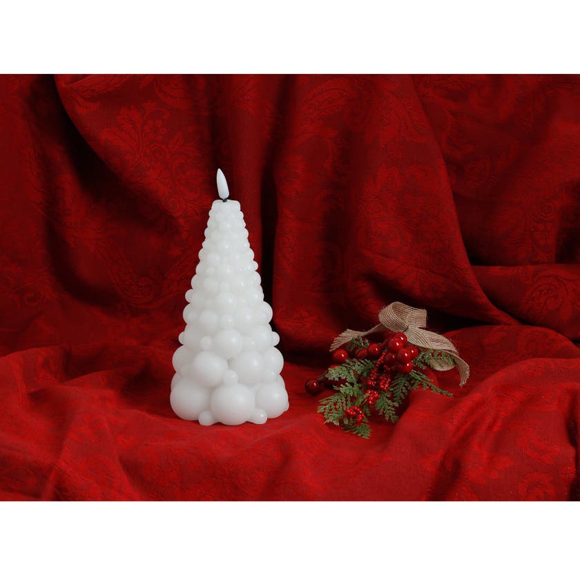 Dekorativt LED-ljus i form av en gran tillverkad av vax med ett vitt ljussken.