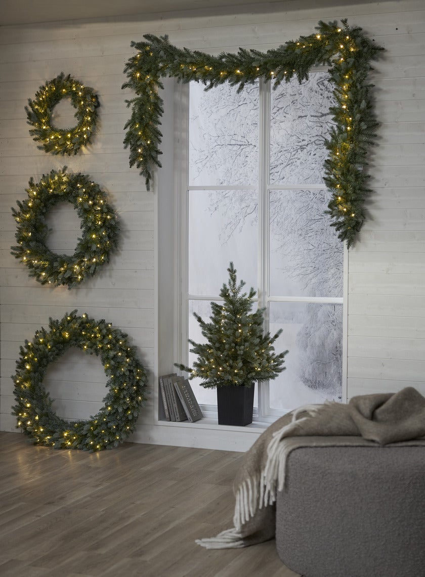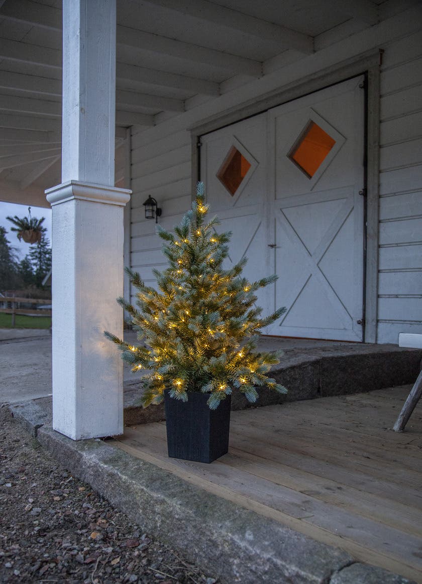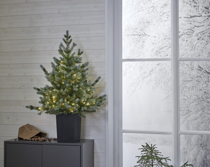 Julgran Greyland LED bordsdekoration . Den är tillverkade av en mix av PE tips och PVC tips med ett vackert grå-grönt utseende. Grenarna sitter fast i lager och ger ett vackert skimrande utseende. Med 80 små varmvita ljuspunkter lyser den upp vackert på en trapp eller inomhus där man önskar en mindre gran. Slingan kan både lysa konstant eller sättas med timer som lyser upp i 6 timmar och är släckt 18 timmar för att sedan tändas igen nästa dag. Den drivs av 3st AA batterier, de medföljer ej. Den svarta krukan medföljer och är ca 170 x 230 mm. I samma familj finns även en stor gran, kransar och en girlang.