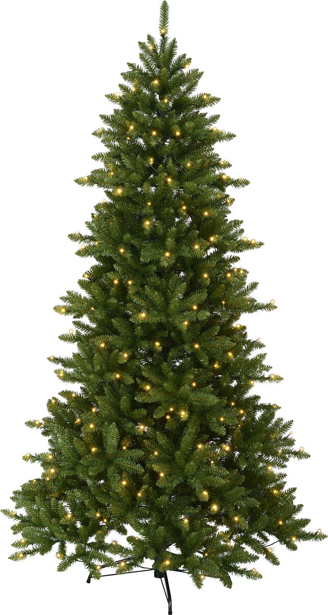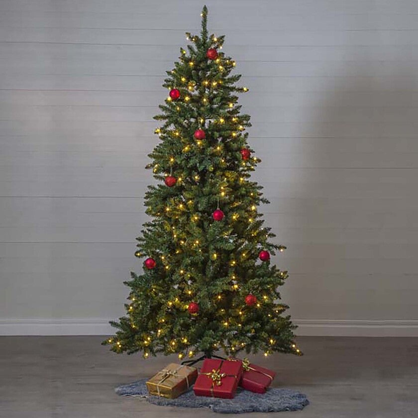 Julgran LED Minnesota. Julgran med LED-belysning för inomhus eller utomhusbruk. Granen har 280 LED-ljuskällor som avger ett härligt varmvitt sken. Grenarna är permanent fastsatta vid stammen i gångjärn och fälls ned när man monterar granen.