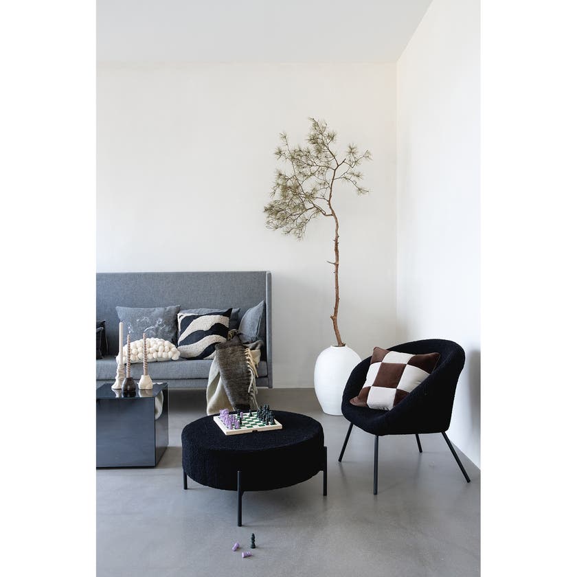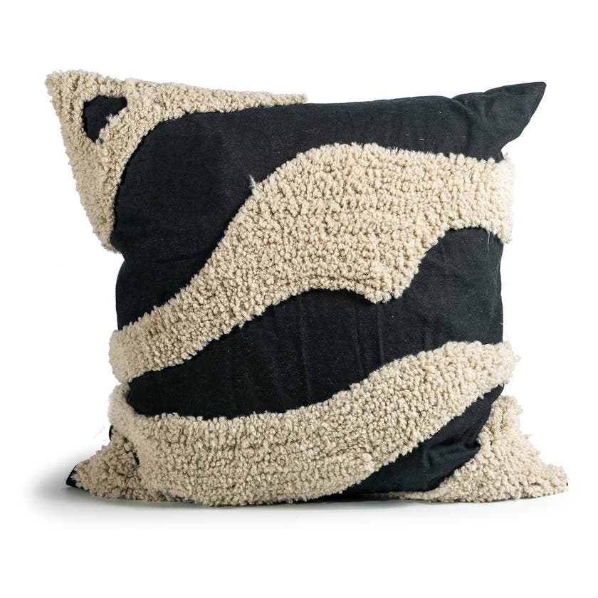 Kudden Fluffy är lekfullhet och nyfikenhet i ett. Det organiska mönstret av vågor och nivåskillnaderna mellan fransar och sammet skapar något alldeles unikt och extra. Mönstret är i en perfekt match mellan svart och beige.