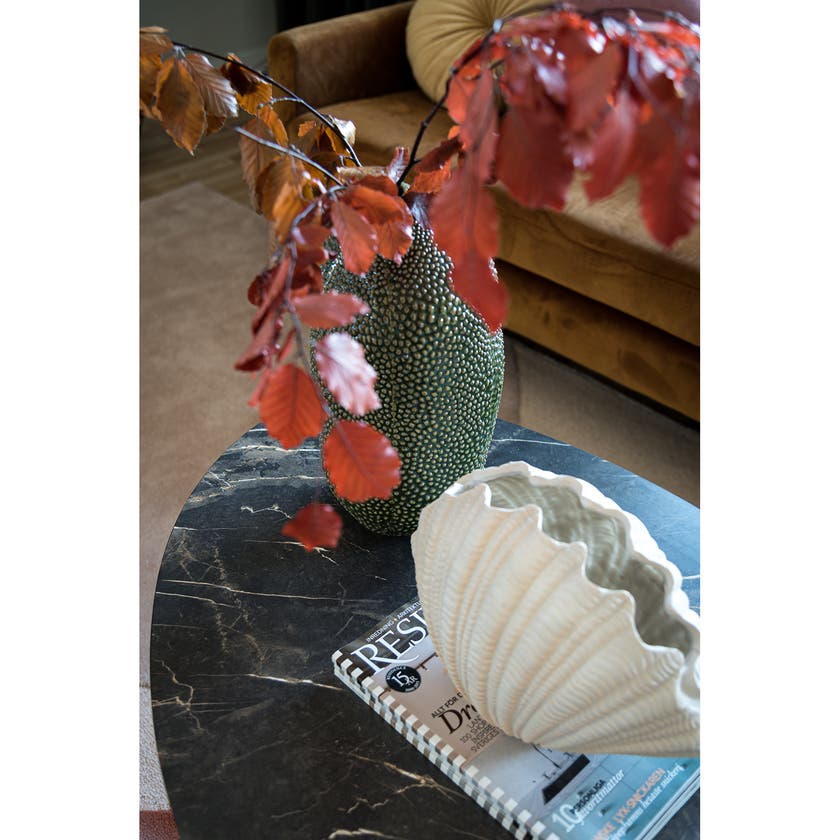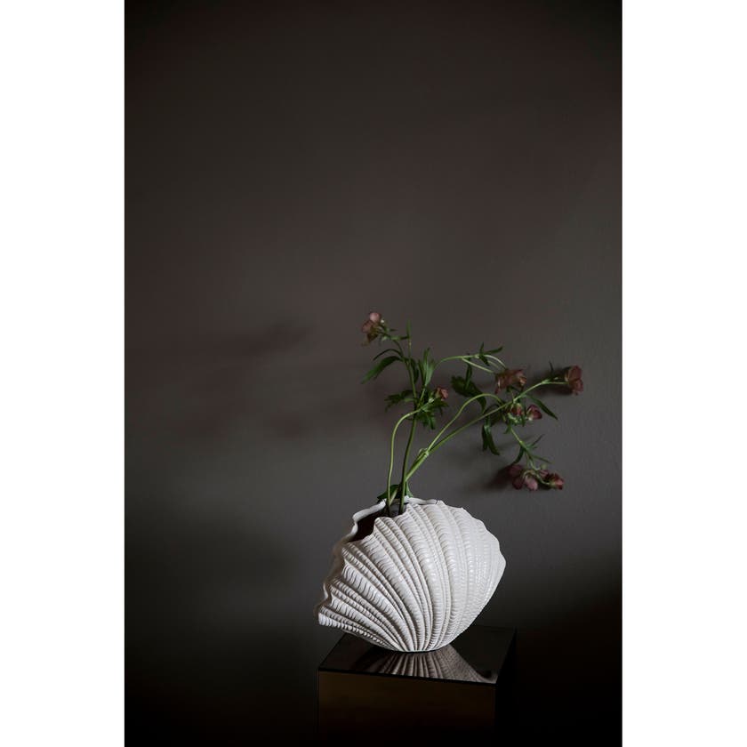 Vas Snäcka är gjord i materialet polyresin, ett material som tillverkas av restprodukter av bl a porslin. Vasen är formgjuten och unik i sitt uttryck. Den tar sin plats på ett behagligt sätt och är lika vacker med prunkande blommor som utan.
