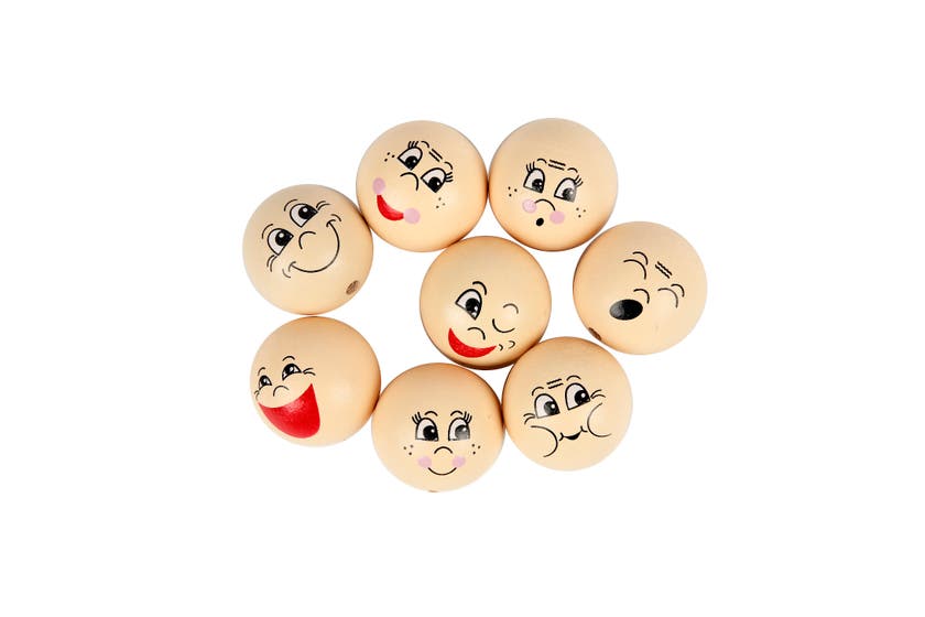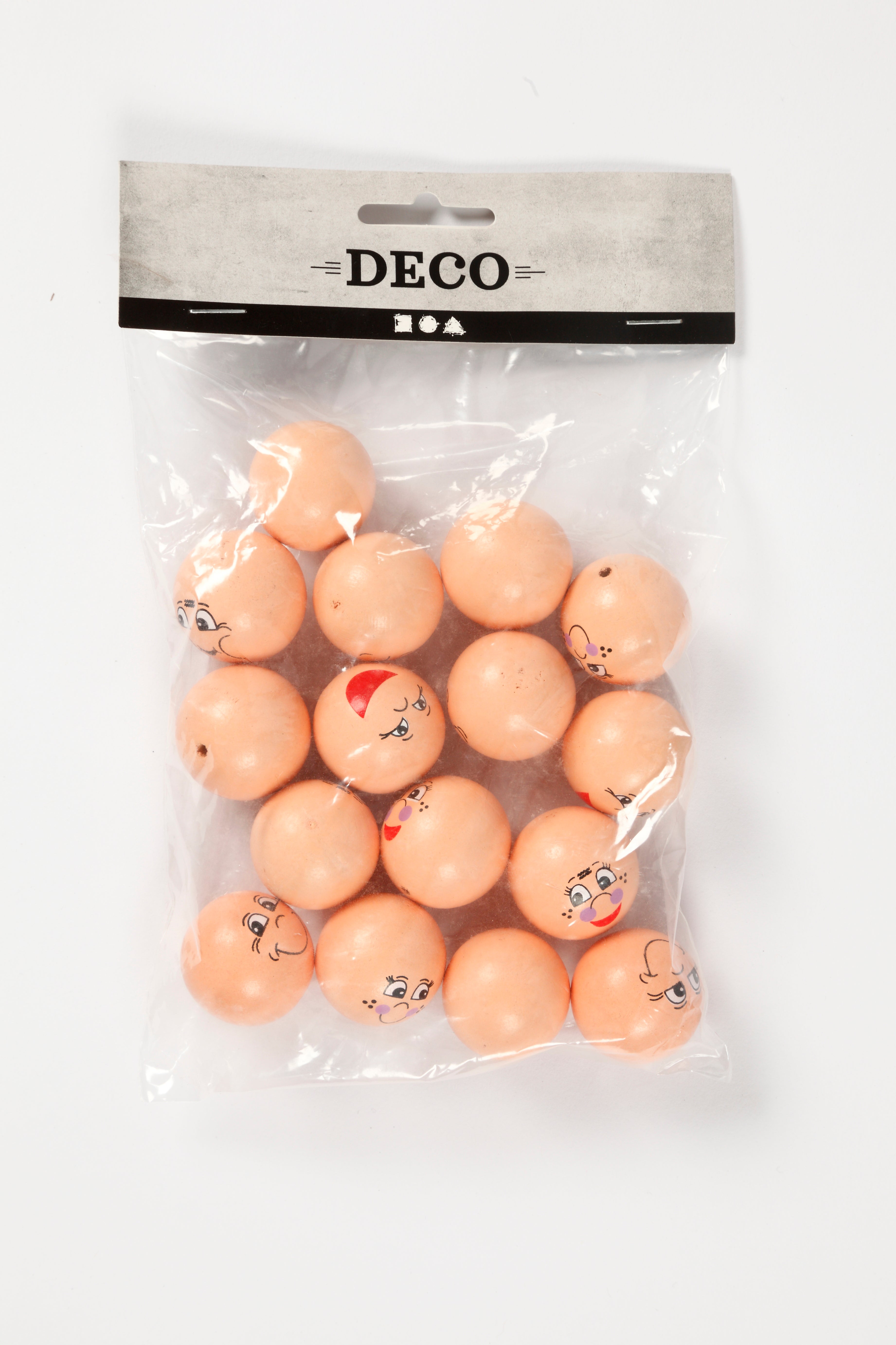Målade huvuden/ansikten i trä. Träpärlor med halvborrade hål med 8 olika roliga uttryck à 2 st/fp.