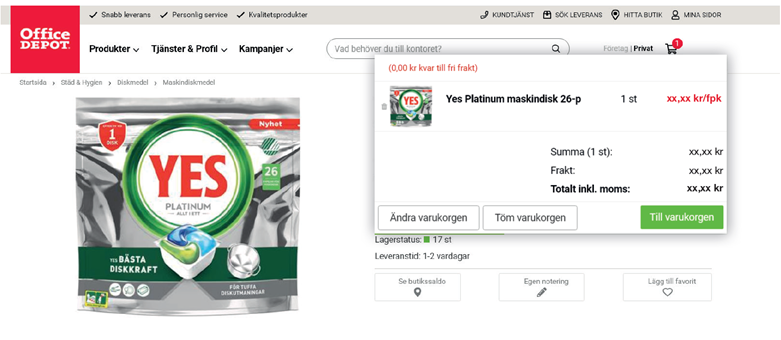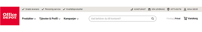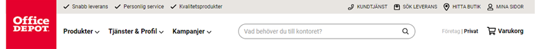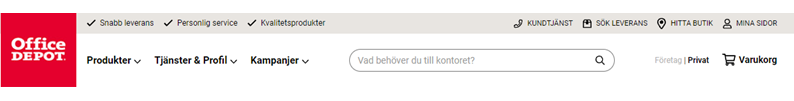 Högst upp i mitten hittar du sökrutan, där du kan fritextsöka efter det du letar efter. För att komma tillbaka till startsidan/hem, kan du alltid klicka på Office Depot loggan till vänster. Du navigerar enkelt till våra produkter, ser våra aktuella kampanjer, läser om våra varumärken samt snabbt navigerar in till Mina sidor.