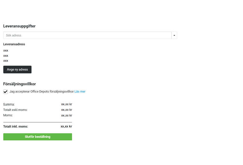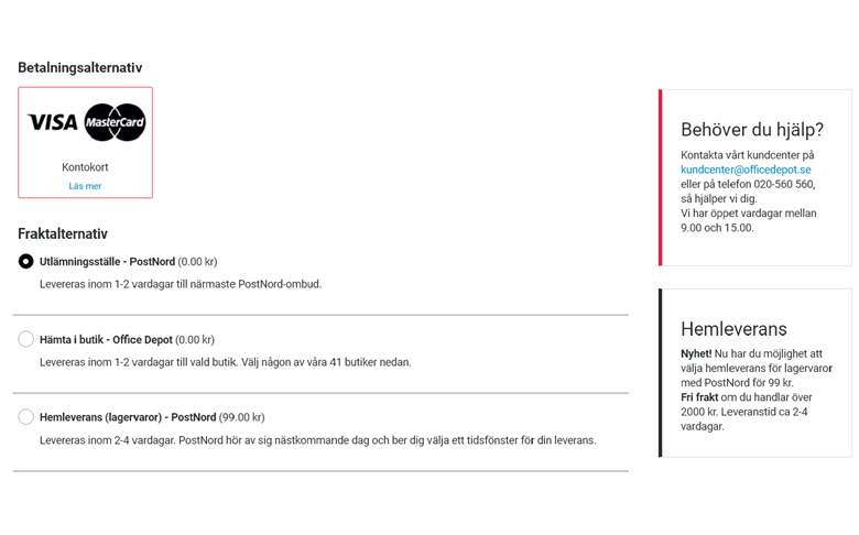 I kassan kan du välja frakt- och betalningsalternativ. Har du fakturabetalning är detta förvalt. Du kan även byta leveransadress genom att klicka på knappen Ange annan adress. När du känner dig klar, klicka på Slutför beställning, ordern färdigställs och det skickas en orderbekräftelse till din angivna e-postadress. Tack för att du valt att handla hos officedepot.se!