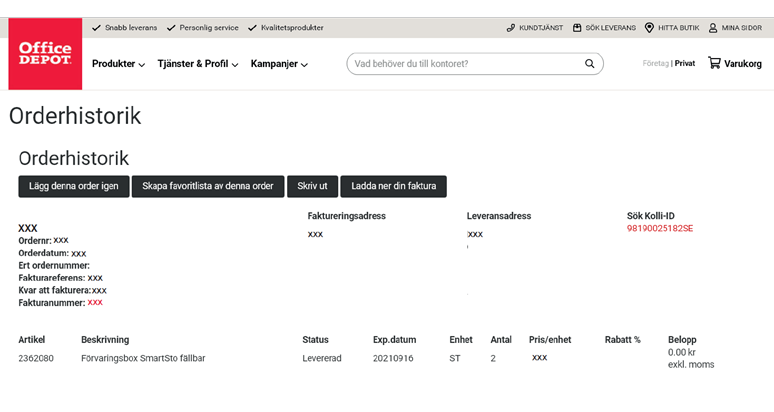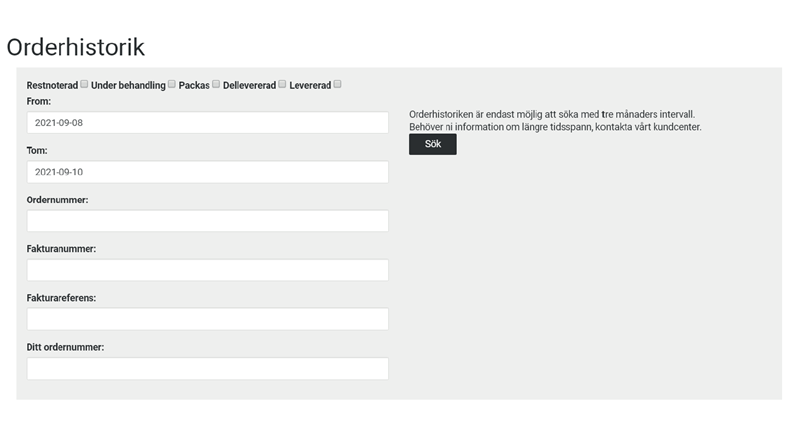 Under Orderhistorik kan du se dina tidigare beställningar. Du kan se beställningar gjorda de senaste 3 månaderna. För att få information om beställningar äldre än 3 månader, kontakta vårt kundcenter. Klicka på Sök för att få upp din orderhistorik. om du vill se mer information om din order, klickar du på knappen Visa bredvid respektive order.
