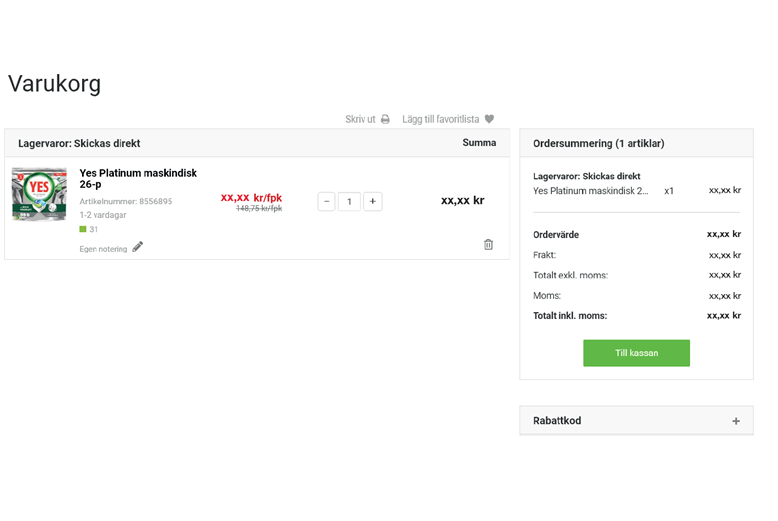 När du känner dig nöjd med din varukorg, klicka på Till kassan. Här kan du ändra antalet på dina produkter, ta bort produkter samt lägga till en eventuell rabattkod. Du ser även summan av ditt köp.