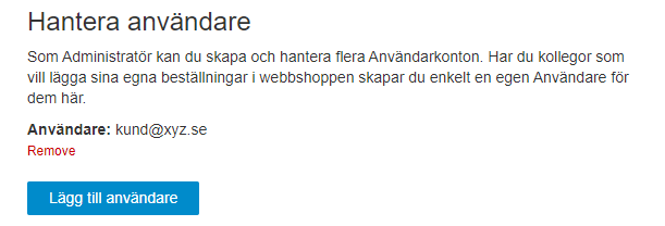 Här kan du även byta lösenord. Om du har rollen som administratör kan du också lägga till nya användare, så att dina kollegor får en möjlighet att beställa.