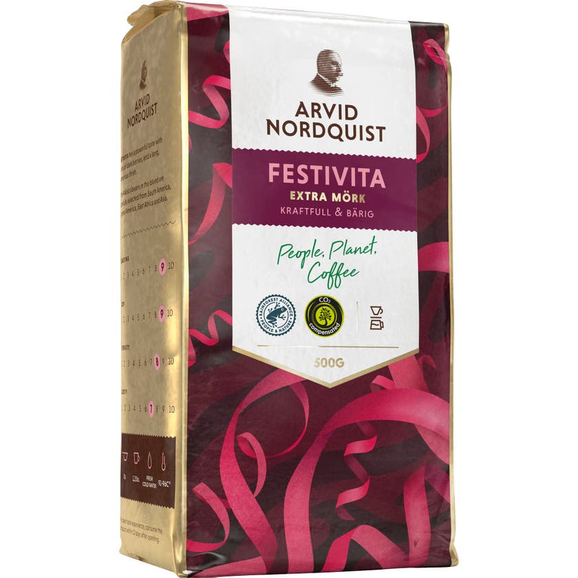 Kaffe Festivita Bryggmalet Extra mörk 500 g Arvid Nordquist. Kraftfull & Bärig. Malet filterkaffe, extra mörkrostat med kraftfull och bärig smak. Certifierad med Rainforest Alliance.