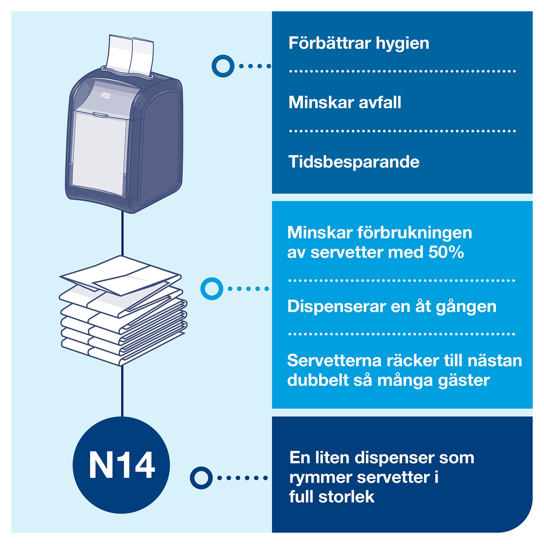 Dispenser för servetter till N14 - Tork Xpressnap Fit® N14 Dispenser System. Här finns flera olika typer av dispensrar att välja mellan, efter dina olika behov och utrymmen.