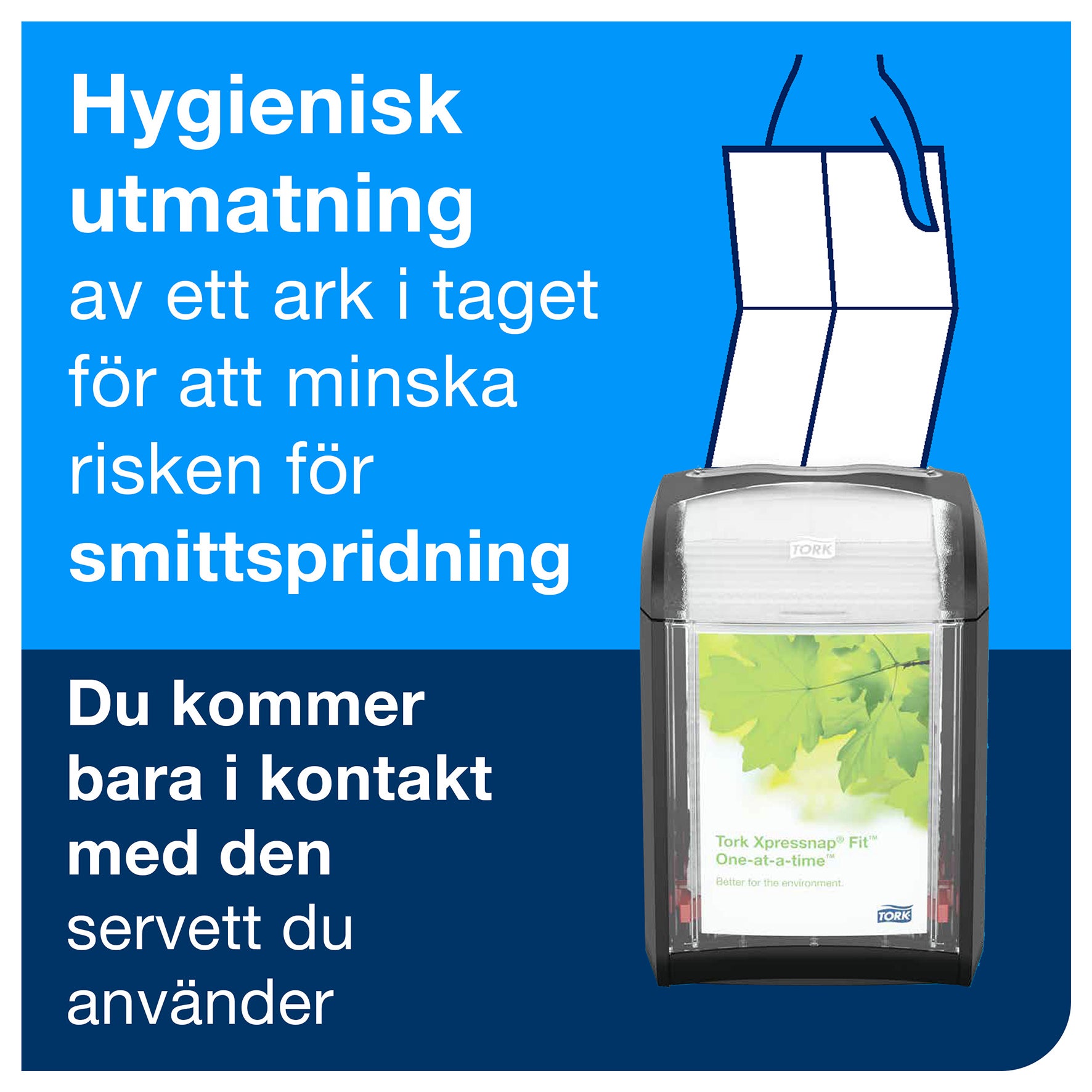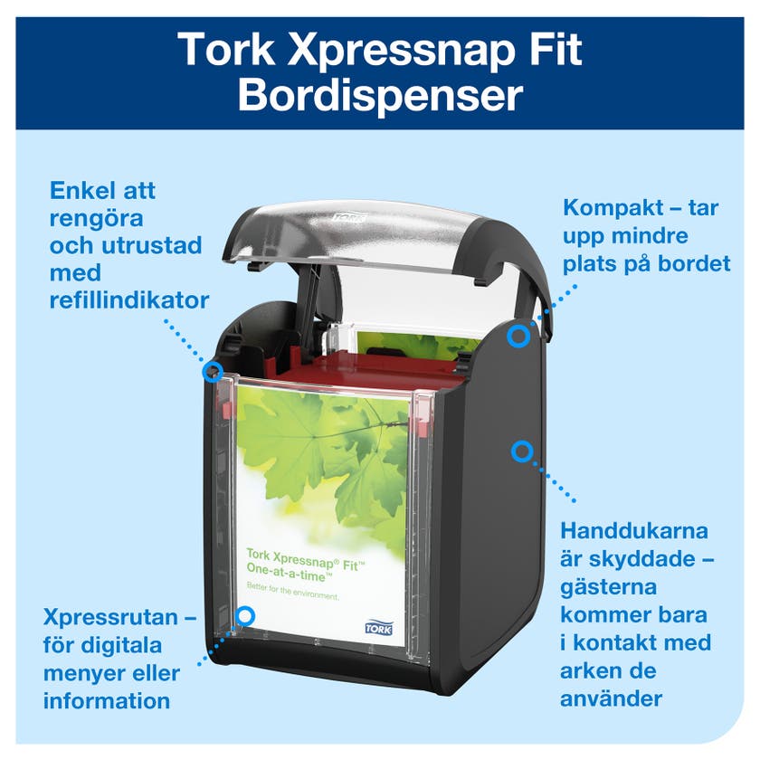 Kompakta dispensrar som matar ut en servett i taget vilket minskar förbrukningen och avfallet. Utmärkt för bord och diskar. Effektiviserar påfyllning och tar samtidigt mindre plats. Tork Xpressnap Fit® Servettdispensrar passar utmärkt för mindre kedjor och fristående restauranger som erbjuder servetter på bord och diskar. Torks mest kompakta Xpressnap dispenser matar ut en servett i taget vilket minskar både förbrukningen och avfallet. Tork Xpressnap Fit® förser fler gäster med servetter mellan påfyllningarna, jämfört med fastfold- och counterfold-system. Det tar även mindre plats i förrådsutrymmet och mer än halverar antalet oanvända bortkastade servetter.