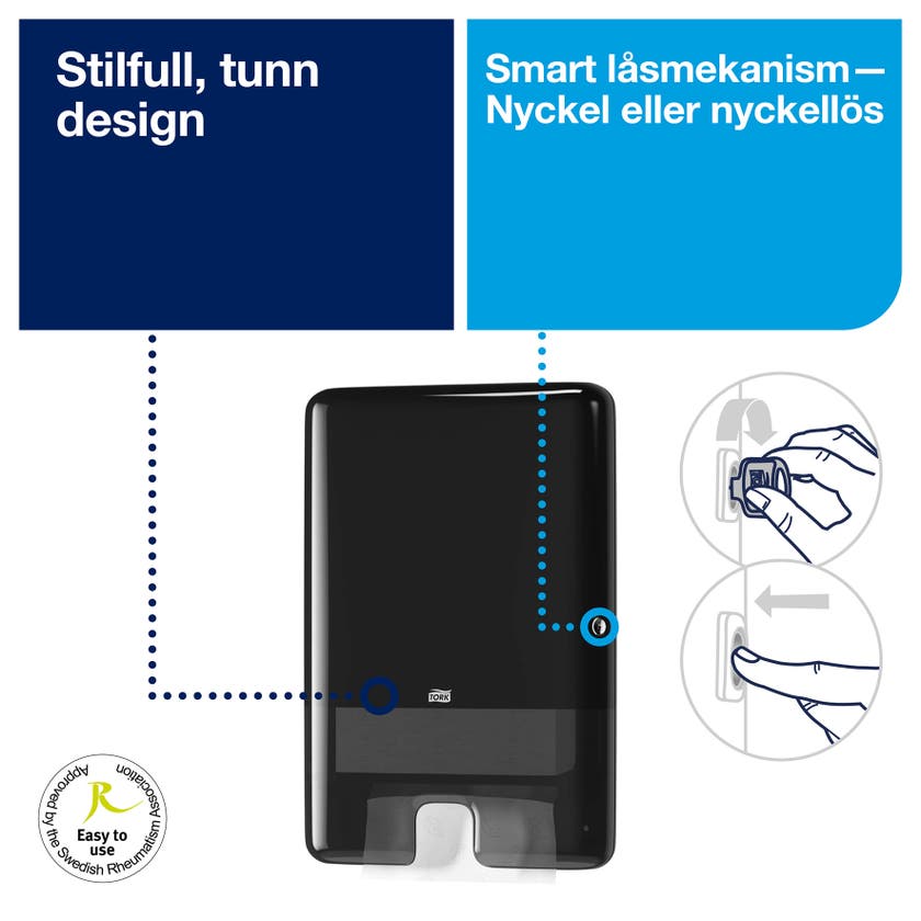 Den kompakta dispensern minskar dessutom avfallet och förbättra dina miljömeriter med hjälp av utmatningen av en handduk i taget, vilket innebär minskad förbrukning och förbättrad hygien. Din personal kommer också att uppskatta färre påfyllningar – den här dispenser har en hög kapacitet som rymmer upp till 2,5 buntar, vilket innebär att fler användare kan betjänas.