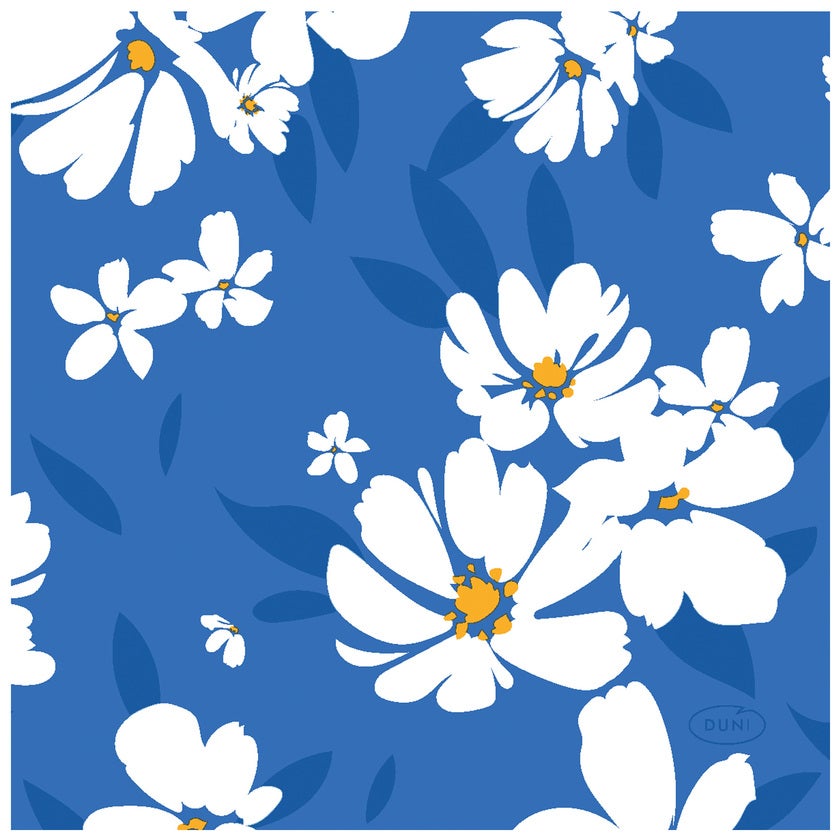 Vackert blommönstrad servett Sunny Day Blue från Duni. Praktisk och tålig tre lagers tissue-servett för många olika ändamål. Svanenmärkta och tillverkade av FSC®-certifierade fibrer. Sunny Day Blue finns som matchande fika- och middagsservetter.
