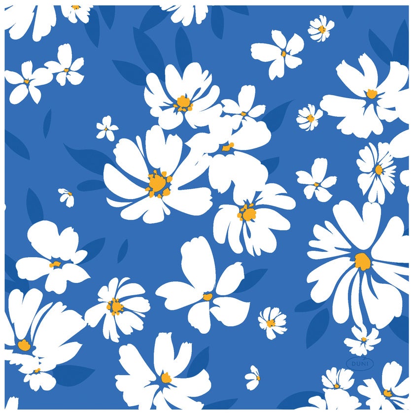 Vackert blommönstrad servett Sunny Day Blue från Duni. Praktisk och tålig tre lagers tissue-servett för många olika ändamål. Svanenmärkta och tillverkade av FSC®-certifierade fibrer. Sunny Day Blue finns som matchande fika- och middagsservetter.