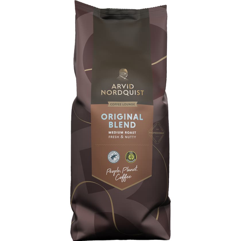 Kaffe Original Blend Malet Mellan rostat från Arvid Nordquist. Frisk & Nötig. Elegant smak med nötiga toner. Lång och frisk eftersmak. Bönorna är 100% Arabica och odlas på hög höjd. Frukten plockas normalt för hand och bearbetas på bästa sätt för att bevara kvaliteten på bönorna.