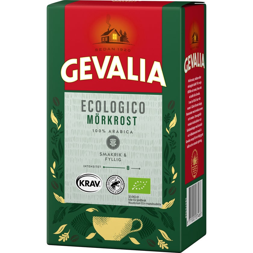 Kaffe Ecologico är Gevalias ekologiska malda mörkrostade bryggkaffe och är miljömärkt med UTZ och KRAV. Detta mörkrostade kaffe består av 100% ekologiskt odlade Arabicabönor, med en välbalanserad och lätt fruktig smak.