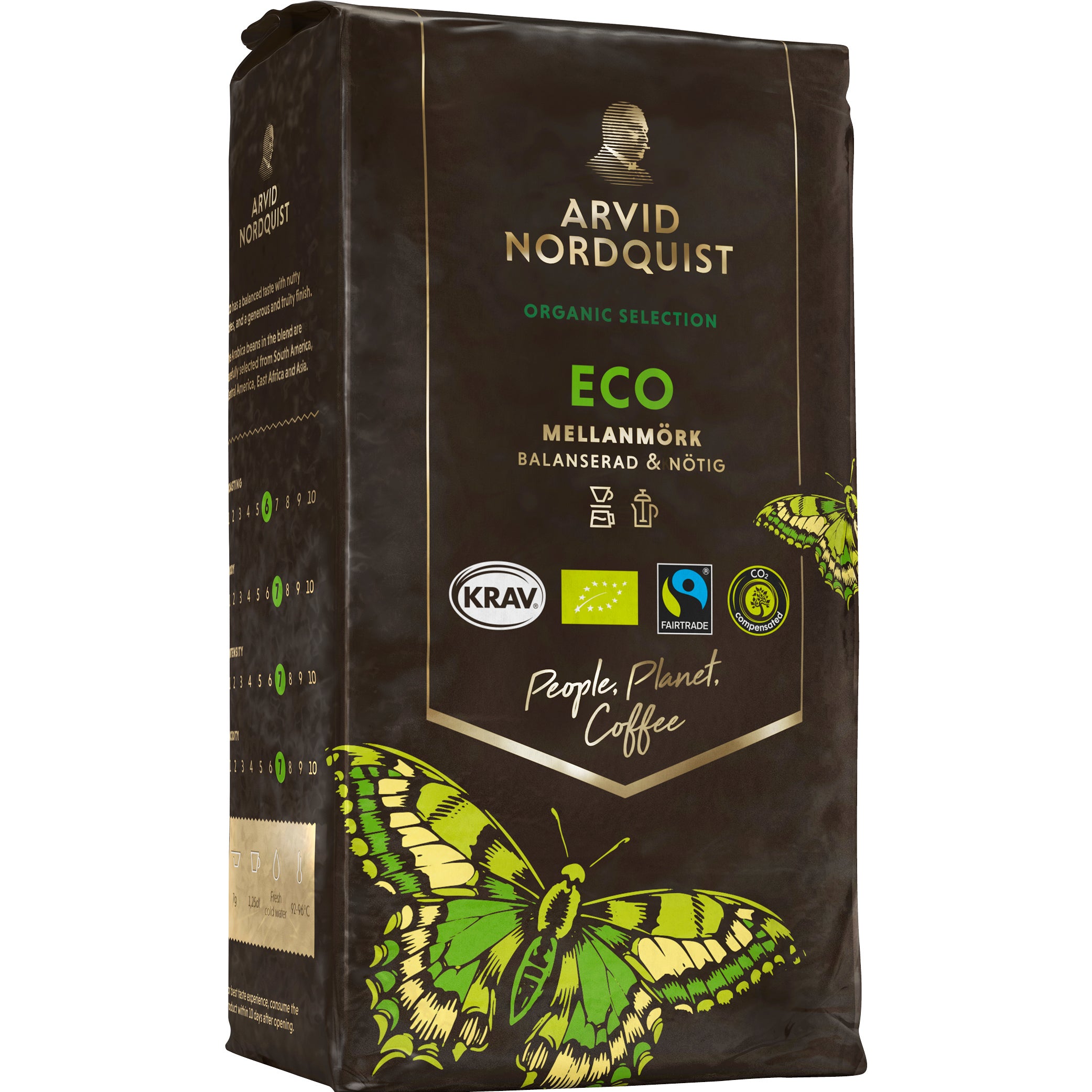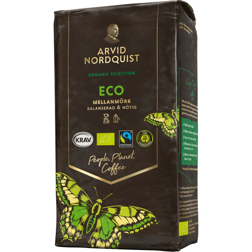 Kaffe Eko Malet Mellanmörk 450 g Arvid Nordquist. Balanserad & Nötig. KRAV-certifierat och ekologiskt malet filterkaffe, mellanmörkt rostat med balanserad och nötig smak.