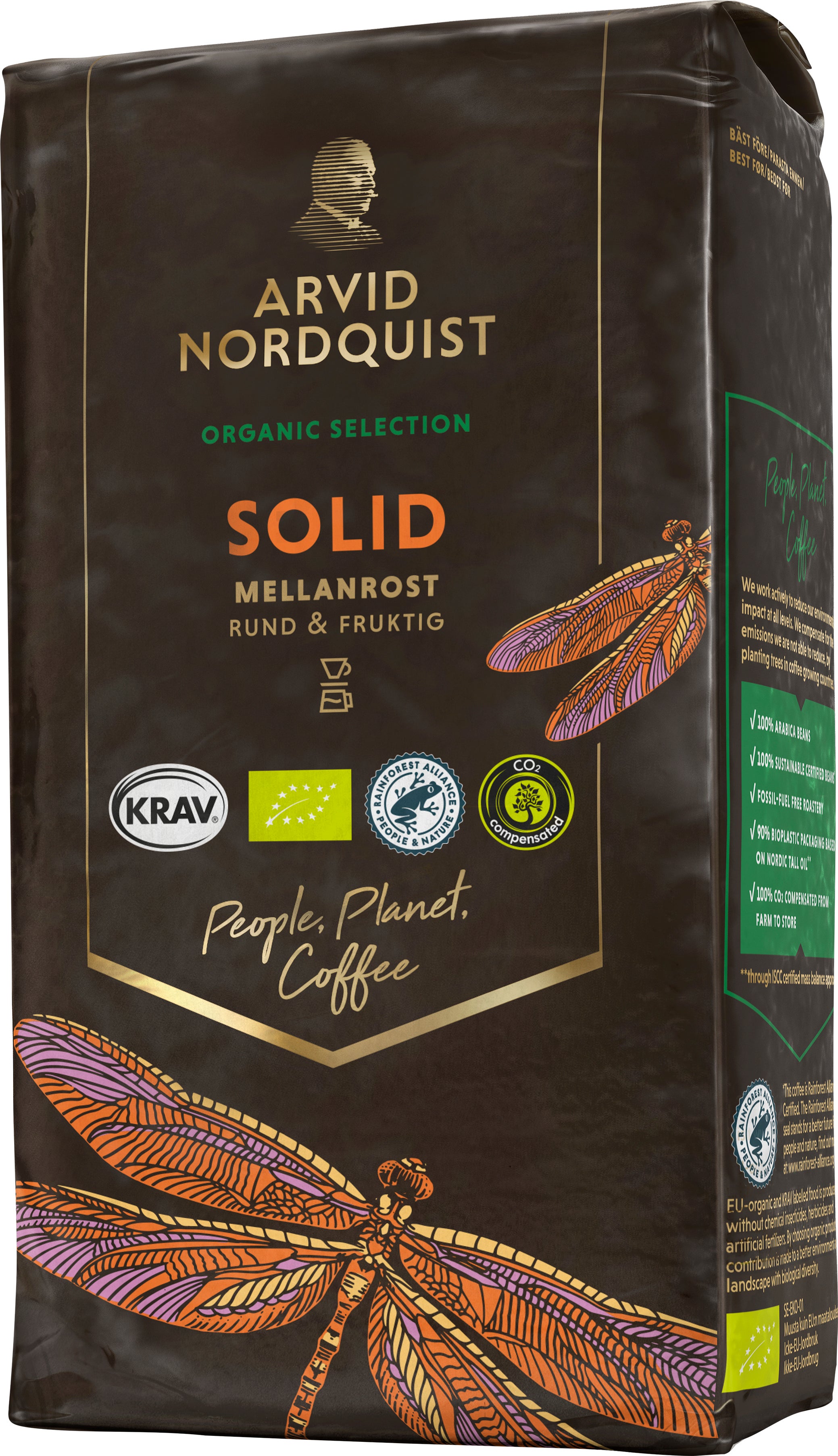 Bryggkaffet Solid från Arvid Nordquist har en rund smak med fruktiga toner, samt en generös och syrlig eftersmak. Känn doften av karamell och mandel. Balanserad smak med ton av fikon och en fruktigt syrlig eftersmak. Smakar lika gott svart som med en skvätt mjölk eller grädde i. Solid består av 100% Arabicabönor och är 100% hållbart certifierat och 100% klimatkompenserat. Certifierade Arabicabönor från Sydamerika, Asien, Centralamerika, Östafrika. Kaffet är dessutom Rainforest Alliance-certifierat. Balanserat och fruktigt kaffe som är både värmande och gott.