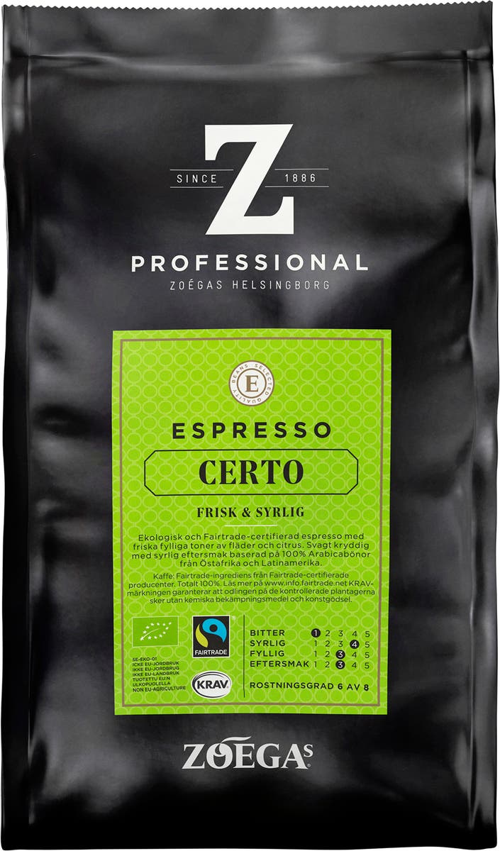 Kaffe Zoégas Professional Espresso Certo. Ekologisk och Fairtrade-certifierad espresso med friska fylliga toner av fläder och citrus. Svagt kryddig med syrlig eftersmak baserad på 100% Arabicabönor från Östafrika och Latinamerika. Förvaras i normal rumstemperatur. Färre gram per kopp. Rostat i Helsingborg.