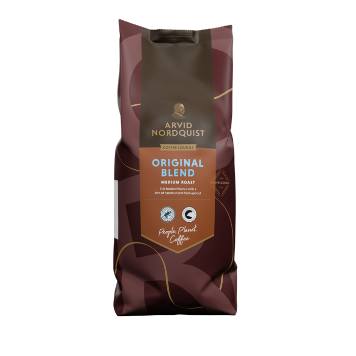 Kaffebönorna Original Blend från Arvid Nordquist har en elegant smak med nötiga toner, samt en lång och frisk eftersmak. Mycket omtyckt och klassiskt kaffe där kompositionen omsorgsfullt vårdats genom åren. Basen utgörs av brasilianska Arabicabönor från röd mineralrik jord. Kaffet doftar lätt med aromer av mörk choklad och ton av fransk nougat. Smaken är fyllig och kryddig med en viss syrlighet. En generöst lång och balanserad eftersmak. En renodlad och elegant smakupplevelse.