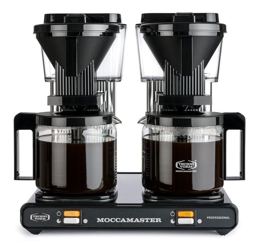 Kaffebryggare Moccamaster Professional Double Black/Silver. Bryggare för kontor. Modellen Professional Double Black/Silver är en effektiv och användarvänlig dubbelbryggare. Denna kontorsfavorit brygger upp till tjugo koppar kaffe på bara sex minuter. Den är enkel att använda och perfekt för alla arbetsplatser.