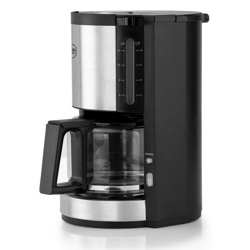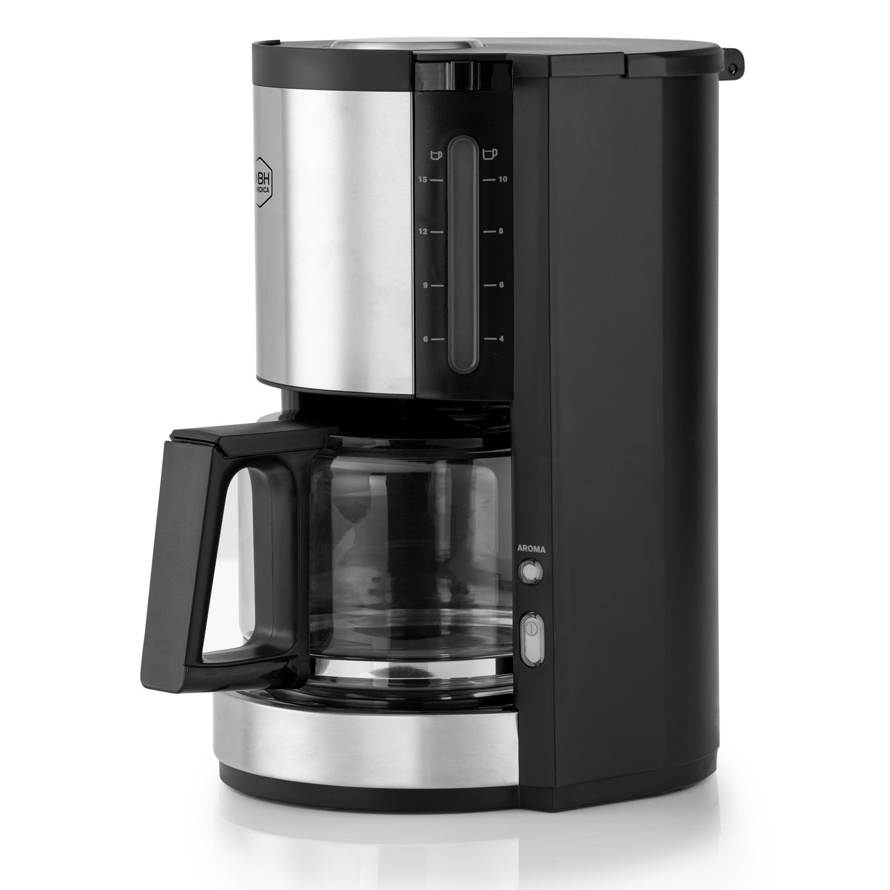 Pro Aroma från OBH Nordica är en stilren kaffebryggare med aromfunktion, så att du enkelt kan justera kaffets styrka efter egen smak. Den mattsvarta designen med detaljer i rostfritt stål gör att bryggaren passar in i de flesta kök. Med en kapacitet på 1,25 liter brygger du upp till 10 koppar åt gången. Bryggaren har en avtagbar filterhållare för enkel rengöring, automatiskt dropplås som förhindrar spill, och automatisk avstängning efter 30 minuter. Vattennivån syns tydligt både på kanna och tank, och locket till vattentanken är anpassat för kök med låga överskåp. Den svängbara filterhållaren gör det smidigt att dosera kaffet.