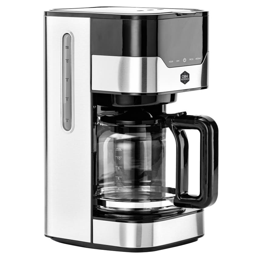 Kaffebryggare Timer Aroma från OBH Nordica gör det enkelt att vakna till doften av nybryggt kaffe. Med timerfunktionen kan du ställa in när kaffet ska börja bryggas, så att det är färdigt när du vill. Aroma-funktionen erbjuder tre olika intensiteter, så att du kan välja styrkan på ditt kaffe. Bryggaren har en stilren design med detaljer i rostfritt stål och tydliga nivåmarkeringar på både vattenbehållare och kanna.