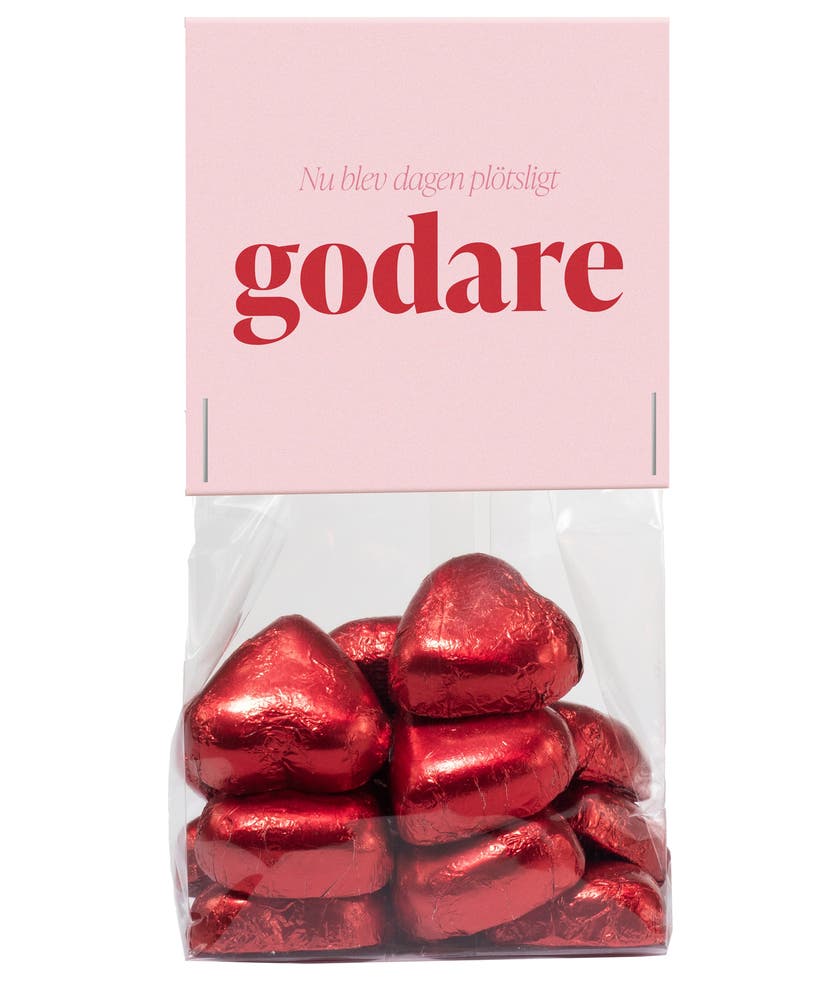 Cellofanpåse från Goody, fylld med härliga chokladhjärtan inslagna i glimrande röd folie. En påse fylld med uppskattning och omtanke!