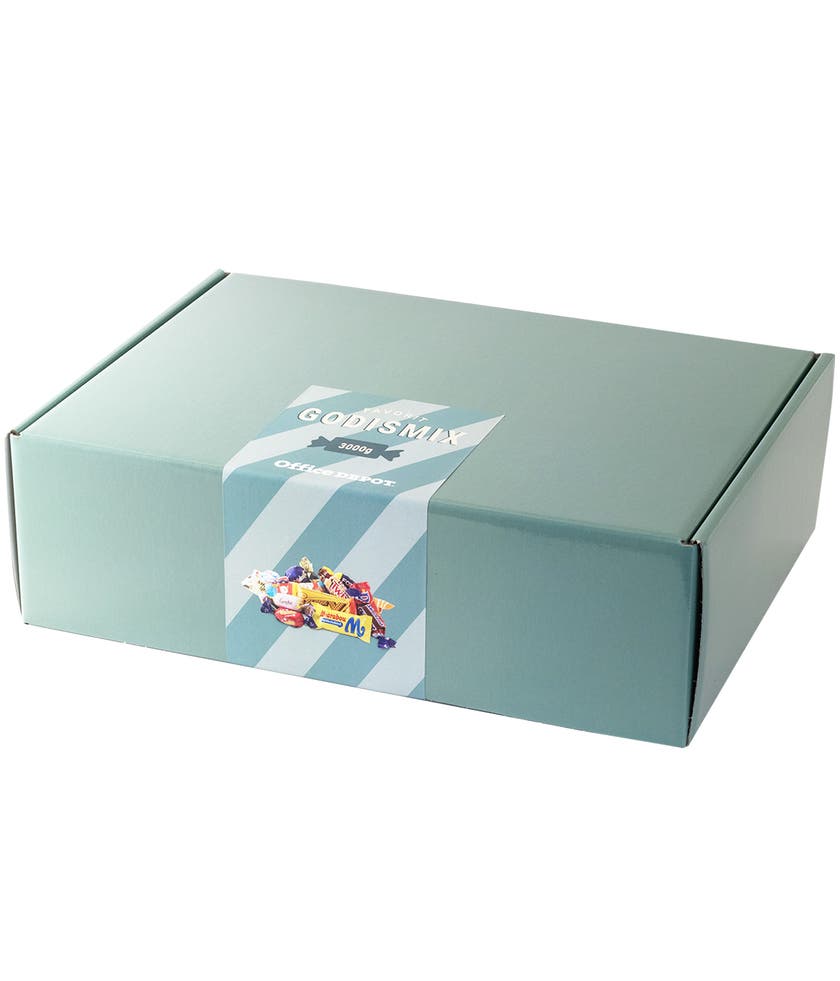 Stor godislåda i FSC-märkt wellpapp fylld med 3000 g av de mest populära inslagna godisbitarna som Plopp, Geisha, Kexchoklad, Dumle, Patroner, Mars, Bounty med mera. En härlig godismix med något för alla smaker!