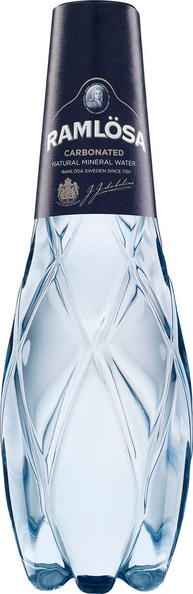 Mineralvatten Ramlösa premium kolsyrad i en snygg designad flaska.