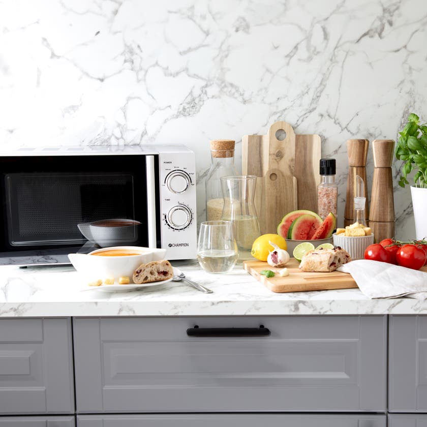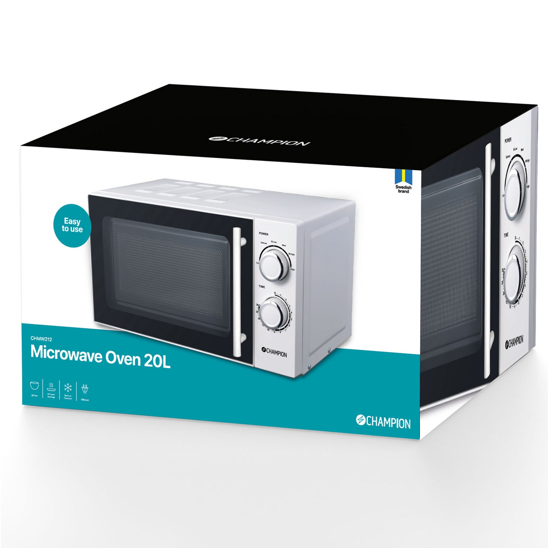 Champions mekaniska mikrovågsugn MW212 rymmer 20 liter och har extra god takhöjd, vilket gör den idealisk för det skandinaviska hemmet. Med funktioner som upptiningsprogram, roterande tallrik och timer blir matlagningen smidigare i vardagen. De sex olika effektlägena, de manuella reglagen och det rejäla handtaget gör mikrovågsugnen enkel och bekväm att använda.