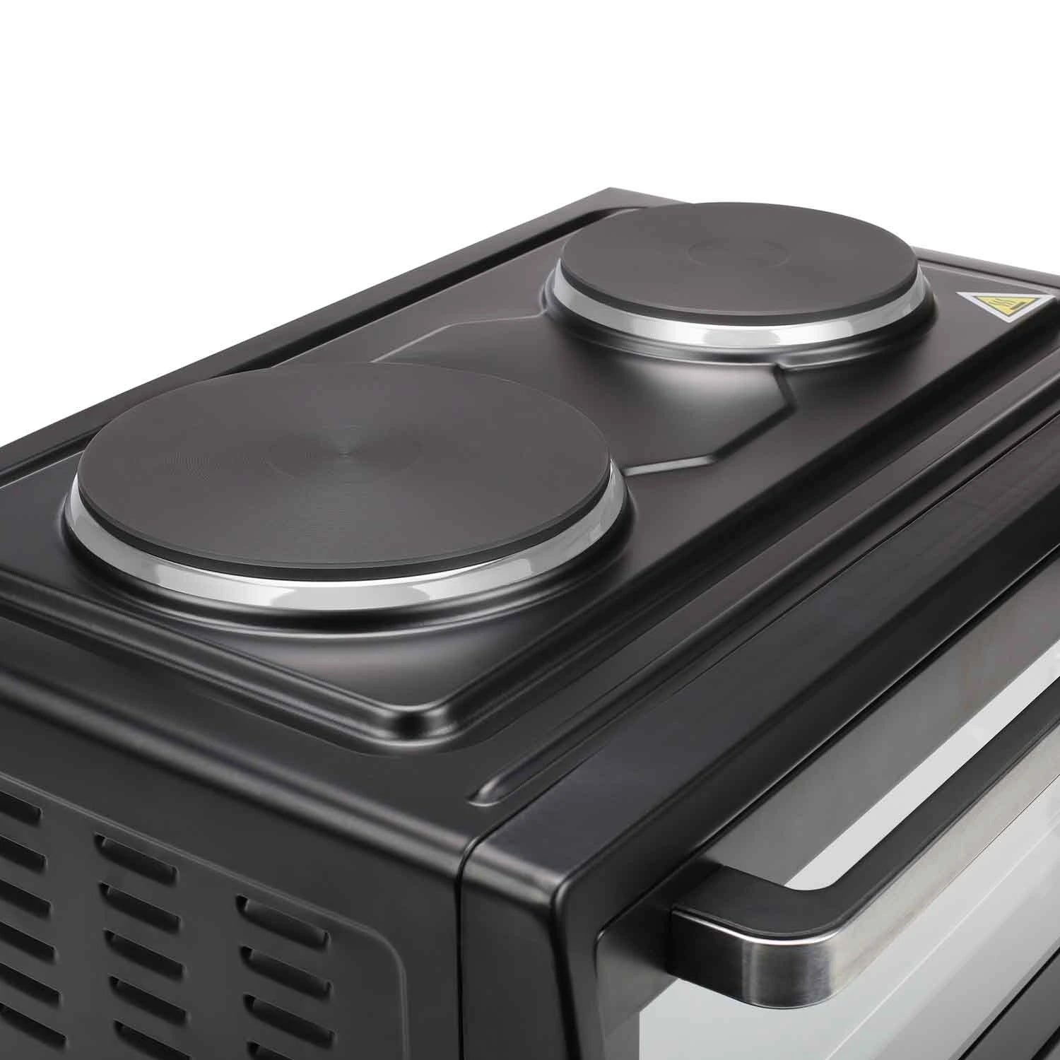 Denna bänkspis kombinerar en rymlig ugn på 35 liter med två kokplattor, vilket gör den till en praktisk lösning för mindre kök, stugor eller studentboenden. Ugnen har varmluft, grillfunktion samt övre och undre värmeelement för flexibel matlagning.