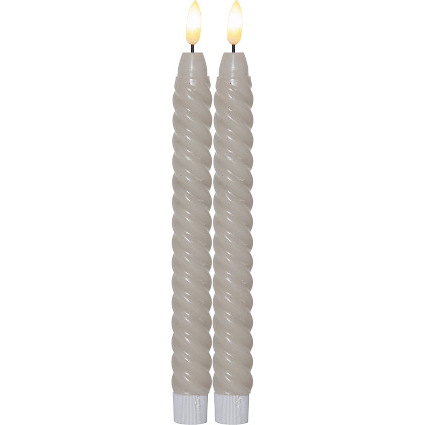 Antikljus LED 2-pack Swirl. Antikljus med twist formad vax i Flamme serien. Den naturtrogna lågan lyser med ett varmvitt sken. Skapar ett mysigt och behagligt sken inomhus. Med inbyggd timer. Storlek på ljuset med låga 250 mm. Batterier ingår ej.
