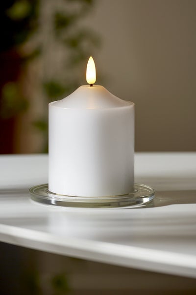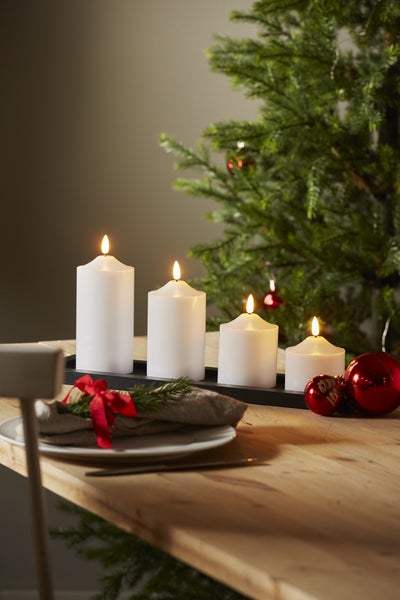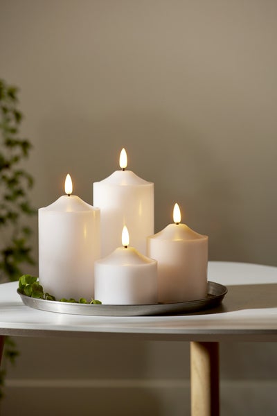 Blockljus i vax Flamme LED, med naturtrogen låga som lyser upp med varmvitt sken. Med synlig låga/ljus. Du får en mysig känsla med den varmvita skenet. Lågan flimrar och ger ett verklighetstroget fint levande sken.Ljuset har inbyggd timer. Endast för inomhusbruk. Batterier ingår ej. Ett brandsäkrare alternativ till levande stearinljus. Lämplig att använda i miljöer där barn och även där äldre vistas. Speciellt till dig som är lite glömskt och inte kommer ihåg att släcka ljuset efter dig. * Vit * Ljusfärg: Varmvit * Ø75 mm * Finns i flera höjder * Användningsområde: Inomhus * Antal lampor: 1 * Ljuskälla ingår: Ja * Typ av ljuskälla: LED * Sockel: Ej utbytbar * Batteriinformation: 2 batterier AA ingår ej. Livstid ca 200h * Timer: 6 h på, 18 h av, repeterande * Strömbrytare: Integrerad * Lystid (h): 10000 * Total effekt (W): 0,03 * Ljuskällans Strömstyrka (mA): 10 * Ljuskällans Effekt (W): 0.03 * Ljuskällans Spänning (V): 3V * Volt: 3V DC * IP-klass: IP20