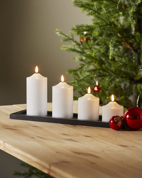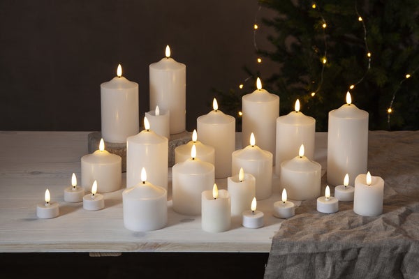 Blockljus i vax Flamme LED, med naturtrogen låga som lyser upp med varmvitt sken. Med synlig låga/ljus. Du får en mysig känsla med den varmvita skenet. Lågan flimrar och ger ett verklighetstroget fint levande sken.Ljuset har inbyggd timer. Endast för inomhusbruk. Batterier ingår ej.