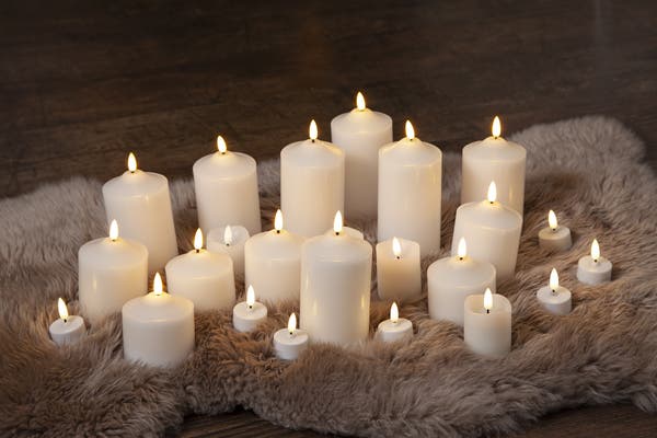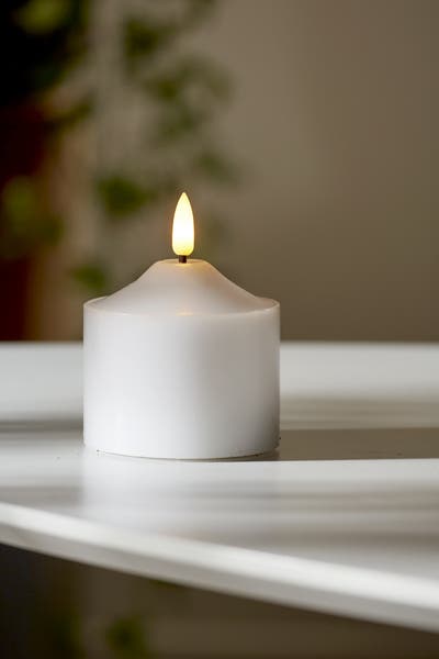 Blockljus i vax Flamme LED, med naturtrogen låga som lyser upp med varmvitt sken. Med synlig låga/ljus. Du får en mysig känsla med den varmvita skenet. Lågan flimrar och ger ett verklighetstroget fint levande sken.Ljuset har inbyggd timer. Endast för inomhusbruk. Batterier ingår ej.