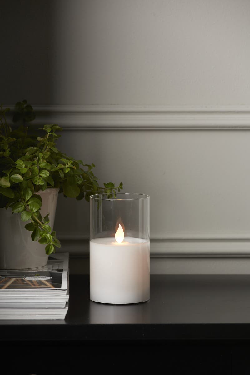 Blockljus LED Vit Twinkle. Transparent glashållare med vaxljus inuti, Twinkle flamman lyser med ett naturligt varmt gult sken. Timerfunktion gör det enkelt att ställa in när ljuset ska lysa. Batterier ingår ej.