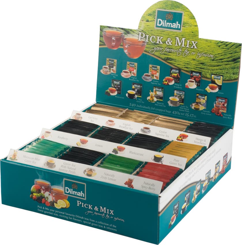 Dilmahs te i en stor sortimentsask med 240 påsar. Innehåller en blandning av svarta, gröna och koffeinfria teer.
