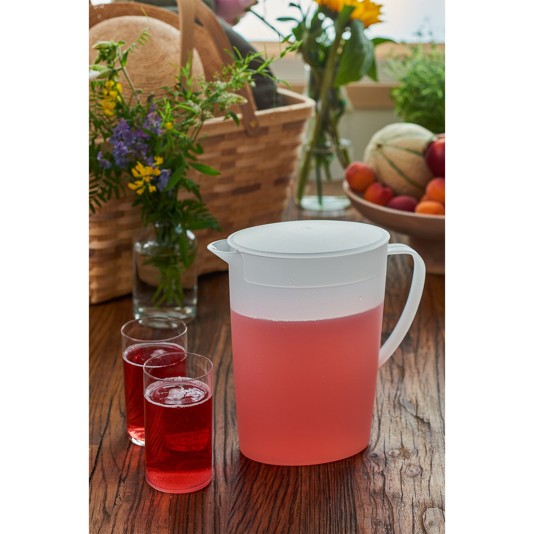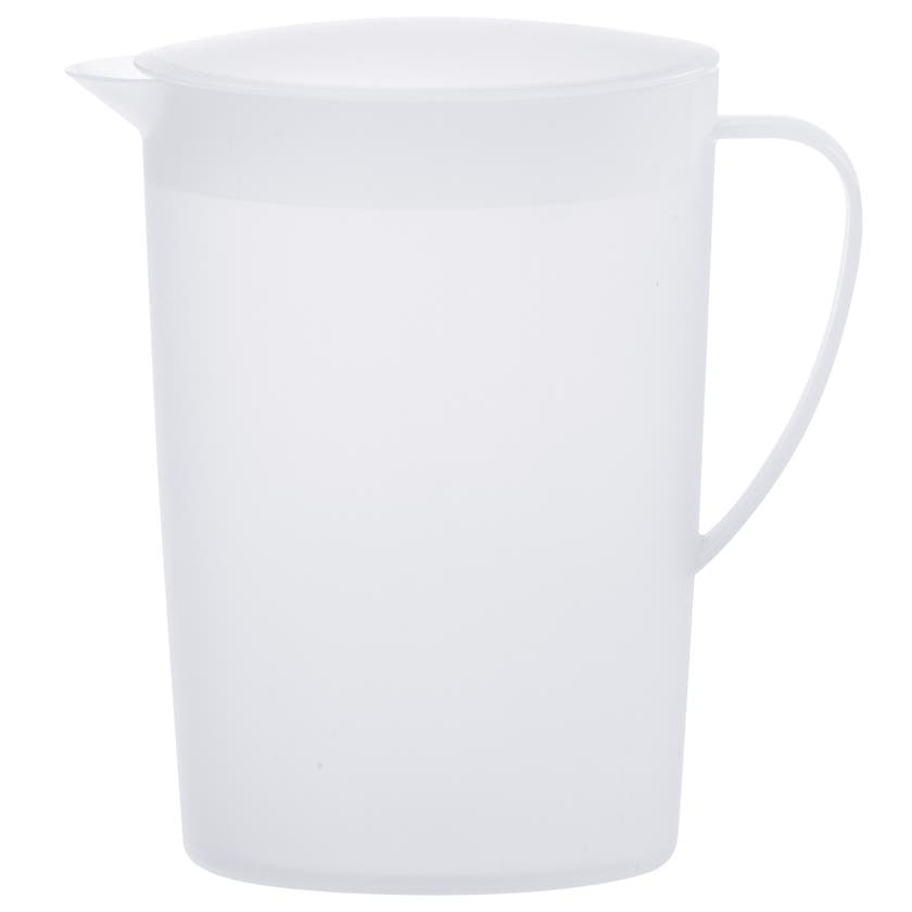 Serveringskanna med lock. Passar perfekt i kylskåpsdörren. Beroende på vilket håll locket är placerat är kannan öppen eller stängd.